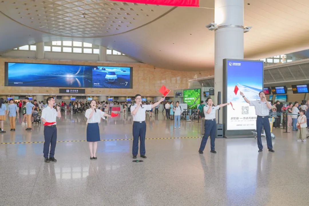 活动最后,旅客们纷纷加入《我和我的祖国》的大合唱中,挥动着手中的国旗,深情应和,尽情抒发心中对祖国的热爱,向祖国母亲献上最真挚的祝福。