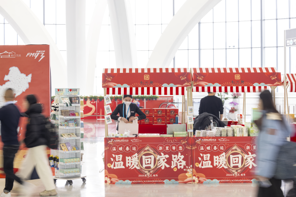 本次集市位于T4出发大厅,共设立17家年货商品摊位,邀请浙江省知名年货品牌及来自山区26县的助农特色产品入驻。优质茶叶、精美年货礼盒、普陀特色礼盒、灵隐寺文化创意产品以及各式服饰等琳琅满目。此外,航站区中心还结合非遗传统文化,邀请非遗捏泥人、皮影戏、吹糖人等传统手工艺者进行现场表演,打造浓浓年味。